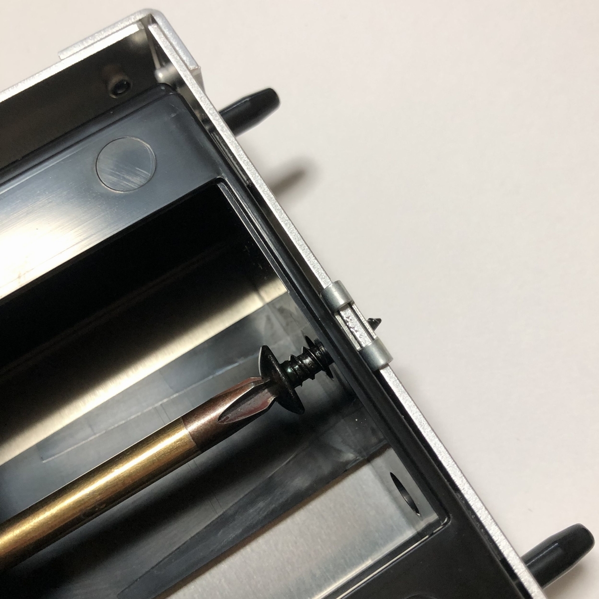 ネジを差し込みにくいですが、2番のプラスドライバーで締め込みます。