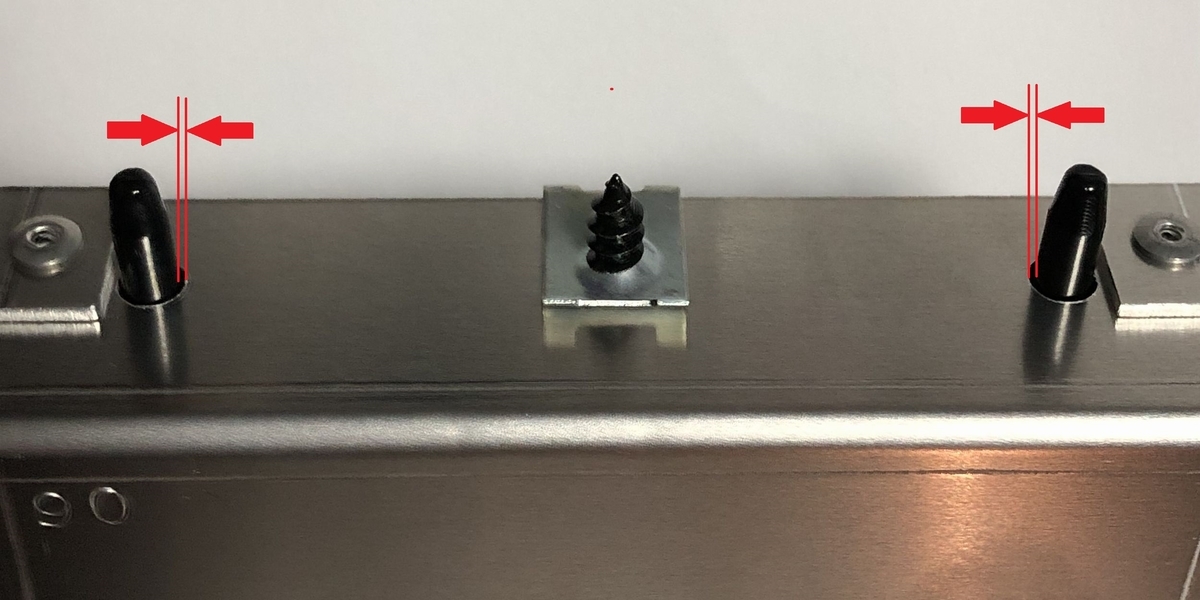 上は約3mm程度、左右は1~2mm程度の隙間になります。ネジ2本を緩めて前板を動かして位置が決まったらネジ2本を締め込んで固定します。