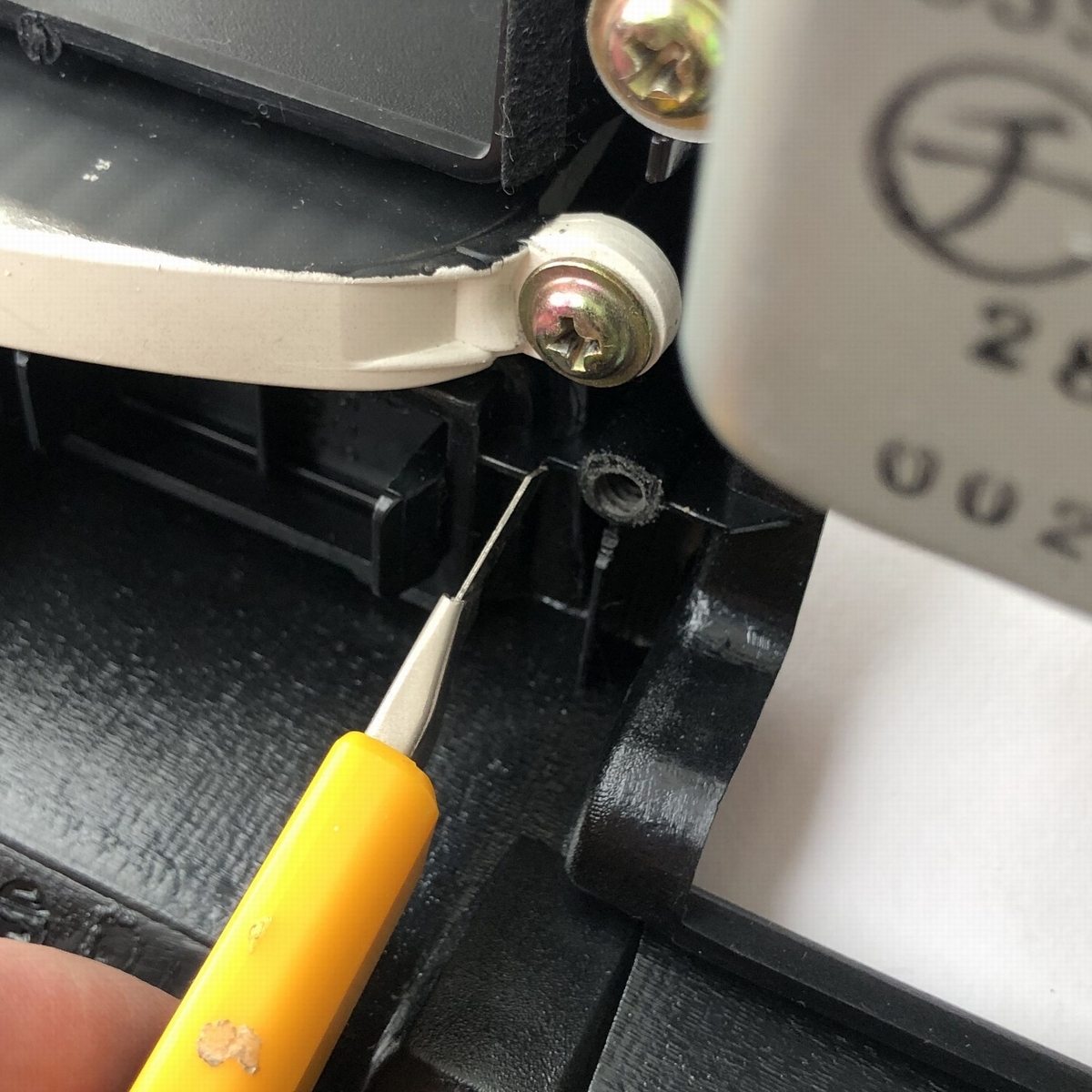 配線が挟まっていないか確認しながらインパネを押し込みます。左手でインパネを押さえながら、右手でネジを締め込みます。(穴が合っていればドライバーをつかわなくても指でネジは締められます)